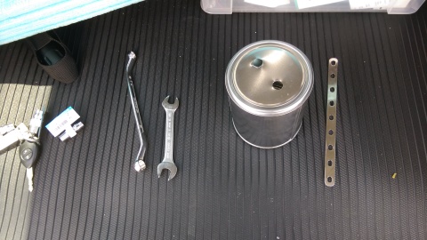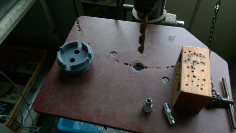 まずはオイルキャッチタンクの自作から始めましょう♪ コーナンにて、塗料缶とエア配管接続用の金具を購入! 会社で亘りバーを拝借www 工具も借りて、作業スタート・・・・ 写真はボール盤でほじった後!! しかし、板厚が薄いのでバカ穴になってしまい むりくりWをかますハメに・・・ |