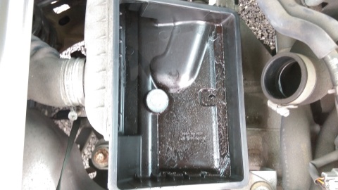 場所をオートバックスに移して、エアクリのエレメント交換の為 エアクリオープン!! 思った通りの光景です。。。 ブローバイに混ざったオイルがべっちょり・・・ |